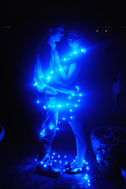 Alex and Jon wrapped in Christmas lights.